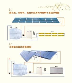 本公司研發(fā)的這套系統(tǒng)是利用太陽能的輻射,將陽光聚合,并運用其能量通過集熱管對水進行加熱產(chǎn)生熱能,經(jīng)過管道輸送進入保溫水箱,然后將水箱里面的熱水輸送至機械的進風口及熟化室通過散熱器將熱能輸出,從而對產(chǎn)品進行烘干、固化,替代用電加熱的效果。