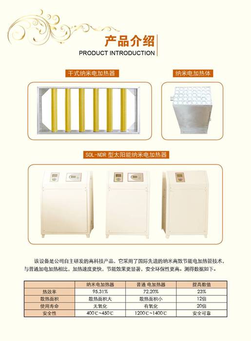 南京兆凱新能源科技有限公司是一家和南京理工大學合作,集科研、開發(fā)、制造和營銷為一體的專業(yè)生產(chǎn)供暖設(shè)備和承接大中型太陽能熱水的高新技術(shù)企業(yè)。以太陽能供熱設(shè)備為主,以納米高效節(jié)能設(shè)備為輔,成功開發(fā)了以太陽能、電能兩種能源交替、互補使用并集供暖、加熱和烘干等用水一體的太陽能、電能高效節(jié)能設(shè)備,獲得了國家知識產(chǎn)權(quán)局實用新型專利產(chǎn)品證書。