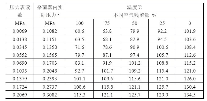 4、假如蒸煮鍋內(nèi)貨架及被殺菌的包裝物占有了鍋內(nèi)50%的空間,另一半為空氣的狀態(tài)下,將蒸煮鍋密閉起來并通入高壓蒸汽,在加熱的同時,開啟排氣閥緩慢地、百分之百地排出蒸煮鍋中的空氣后,當蒸煮鍋的壓力表顯示為0.1035MPa時,蒸煮鍋內(nèi)的溫度可以達到121℃。