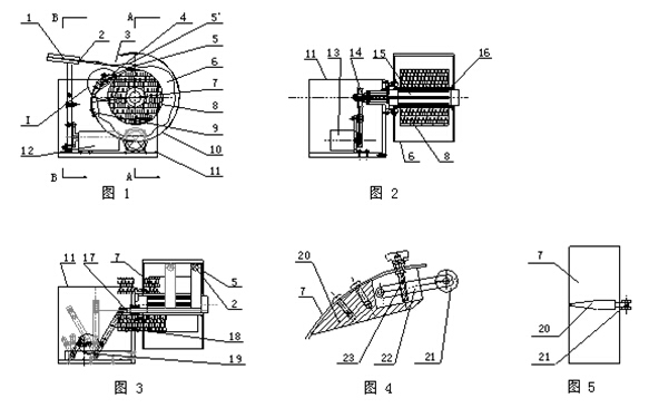 1、吹料管;2、吹料口;3、箱口;4、出風口;5、分切邊料;5’、斷裂邊料;6、卷繞;7、氣流調節板;8、邊料卷;9、鉸鏈;10、固定壁;11、機箱;12、電機;13、力矩電機;14、傳動機構;15、收卷軸;16、筒芯;17、往復桿;18、擺臂;19、桃子凸輪;20、滾輪底座;21、滾輪;22、調節臂;23、調節螺桿