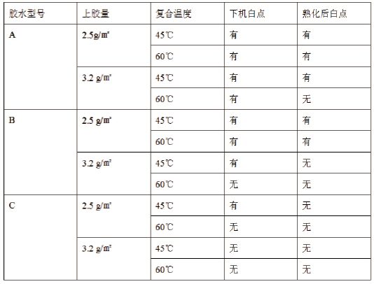 提到白點、氣泡,許多人都有這方面的經歷并有相應的解決辦法,實際生產中我們也發現影響因素較多。由于機器、人員等為已定條件,印刷膜為上一工序的半成品,因此我們對白點問題所做的對比生產實驗,是以膠水、部分工藝參數作變量來滿足生產需求的。節選一些參數如下(復合結構相同):