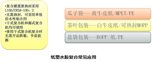 由于水性粘合劑對紙張具有良好的滲透性,因此水性粘合劑在紙張類產品復合具有很好的復合效果,任何薄膜和鋁箔均可采用水性粘合劑和紙張復合,一般該應用是采用雙組分高功能水性粘合劑,可根據耐熱性要求調節固化劑加入的量。主要特點是無溶劑殘留,復合強度高,成本最低。