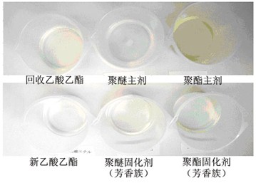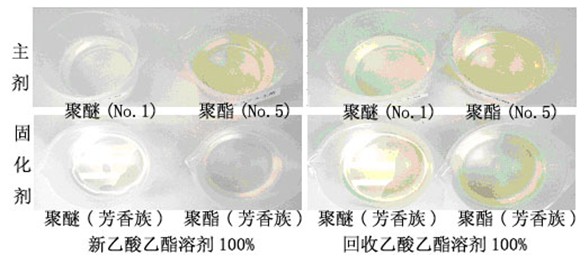 由圖4~圖7可知,回收乙酸乙酯溶劑無論是與聚醚還是與聚酯混合,混合液顏色均有點發黃,但與脂肪族固化劑混合后,混合液顏色無明顯變化。