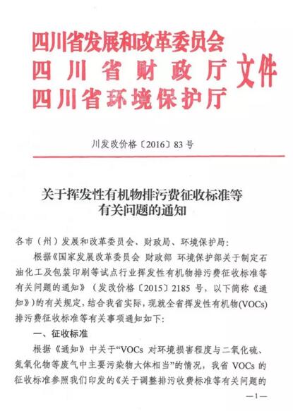 《四川省發展和改革委員會 四川省財政廳四川省環境保護廳關于揮發性有機物排污費征收標準等有關問題的通知》(川發改價格〔2016〕83號)