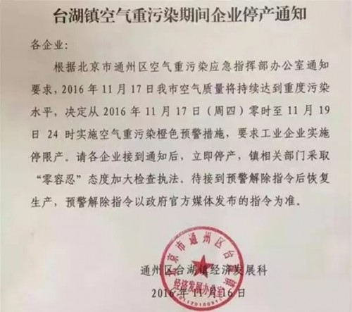 橙色預警發布后,位于北京通州的華聯印刷開始實施限產,并關閉了一些被視為污染源的加工設備。而位于該區的安姆科公司,則實施了全部停產。