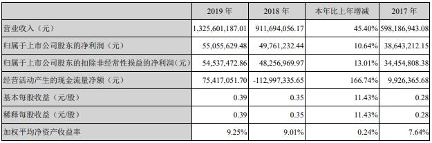 2019年,王子新材實(shí)現(xiàn)營業(yè)總收入132,560.12萬元,超過10億元,同比上升45.40%;歸屬于母公司凈利潤為5,505.56萬元,同比上升10.64%。