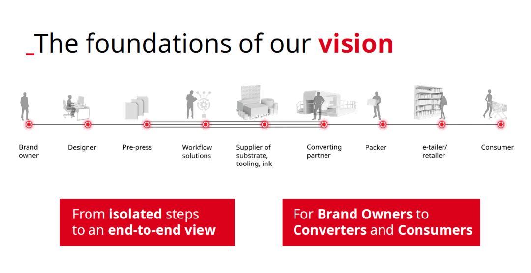 大大小小的品牌所有者都面臨著來(lái)自本地和全球的競(jìng)爭(zhēng)對(duì)手,以及不斷變化的市場(chǎng)期望的壓力。他們面臨著許多挑戰(zhàn),例如更短的上市時(shí)間,更小的批量,以及建立線(xiàn)下銷(xiāo)售和線(xiàn)上銷(xiāo)售之間一致性的需求。當(dāng)前的包裝價(jià)值鏈仍然非常分散,其過(guò)程中的每個(gè)階段都被隔離為多個(gè)孤島。全新的要求,希望所有關(guān)鍵參與者都具有“端到端”的視角。印刷商和加工商則希望消除生產(chǎn)操作中的浪費(fèi)和失誤。