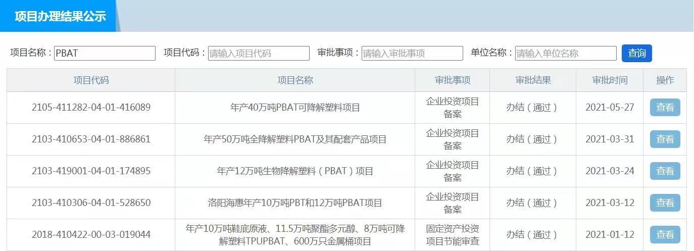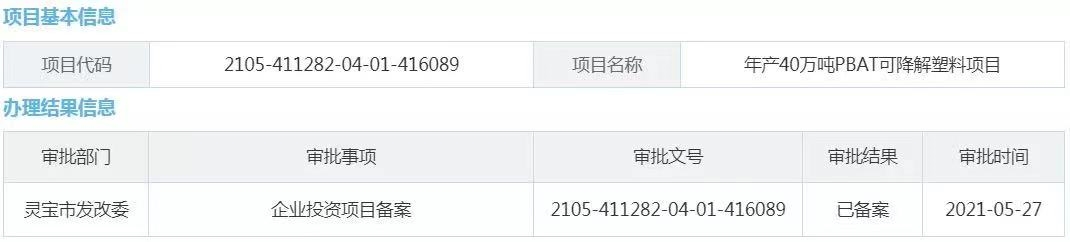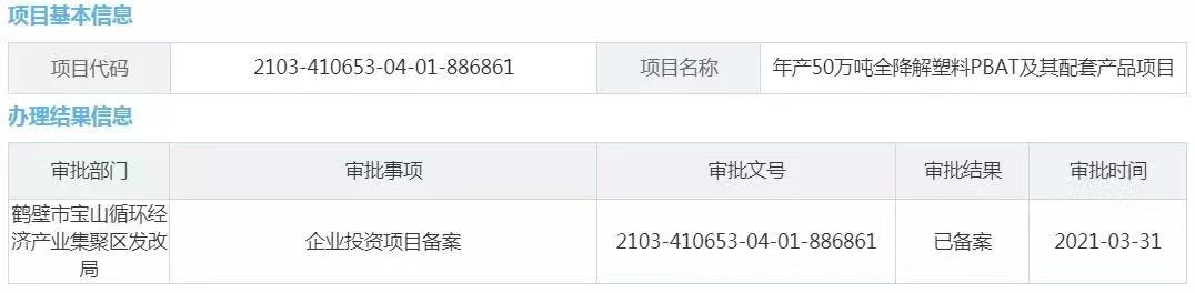 鶴壁寶來化工科技有限公司投資80億,建設年產50萬噸全降解塑料PBAT及其配套產品項目。今年3月31日,該項目經過審批。