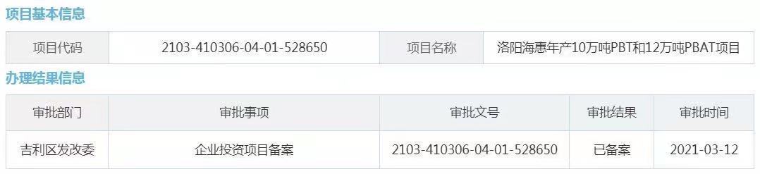 4、洛陽?;菽戤a10萬噸PBT和12萬噸PBAT項目