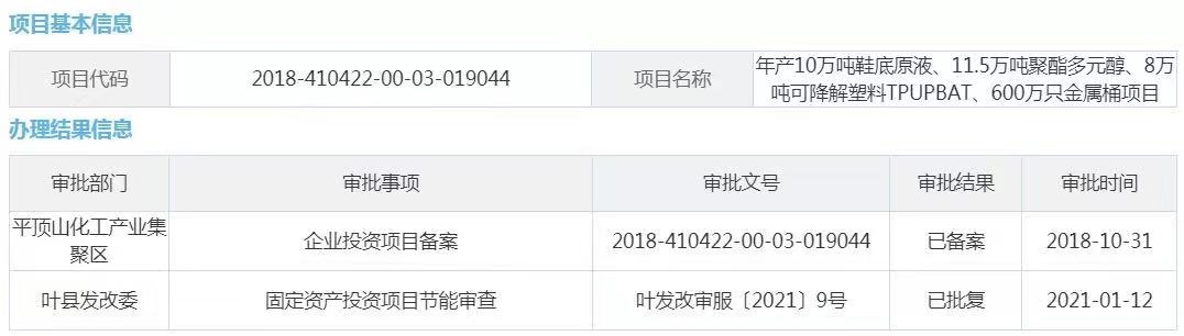 河南恒泰源新材料有限公司年產10萬噸鞋底原液、11.5萬噸聚酯多元醇、8萬噸可降解塑料TPUPBAT、600萬只金屬包裝桶項目,總投資26579萬元,其中8.5萬噸聚酯多元醇和600萬只金屬包裝桶均為自用,項目占地面積81641.6平方米,項目已經平頂山化工產業集聚區備案,備案文號為2018-410422-00-03-019044。